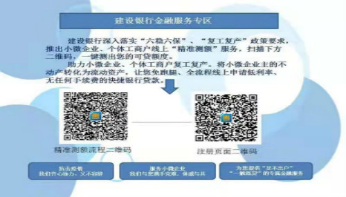 建設(shè)銀行金融服務(wù)專區(qū)2021-03-17建設(shè)銀行深入落實(shí)“六穩(wěn)六保”、“復(fù)產(chǎn)復(fù)工”政策要求,推出小微企業(yè)、個(gè)體工商戶線上“精準(zhǔn)測(cè)額”服務(wù),掃描下方二維碼,一鍵測(cè)出您的可貸額度。珠粒小微企業(yè),個(gè)體工商戶復(fù)工復(fù)產(chǎn)。將小微企業(yè)主得不動(dòng)產(chǎn)轉(zhuǎn)化為流動(dòng)資產(chǎn),讓您免跑腿、全流程線上申請(qǐng)低利率、無(wú)任何手續(xù)費(fèi)得快捷銀行貸款。